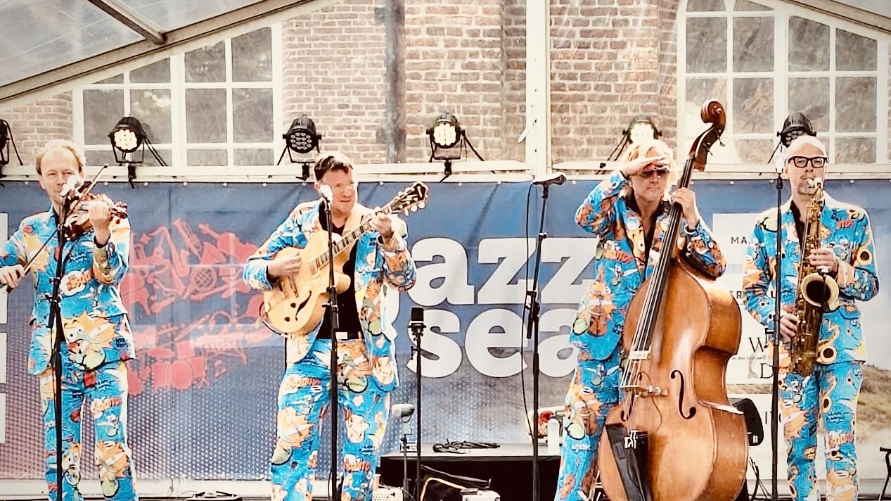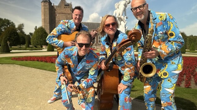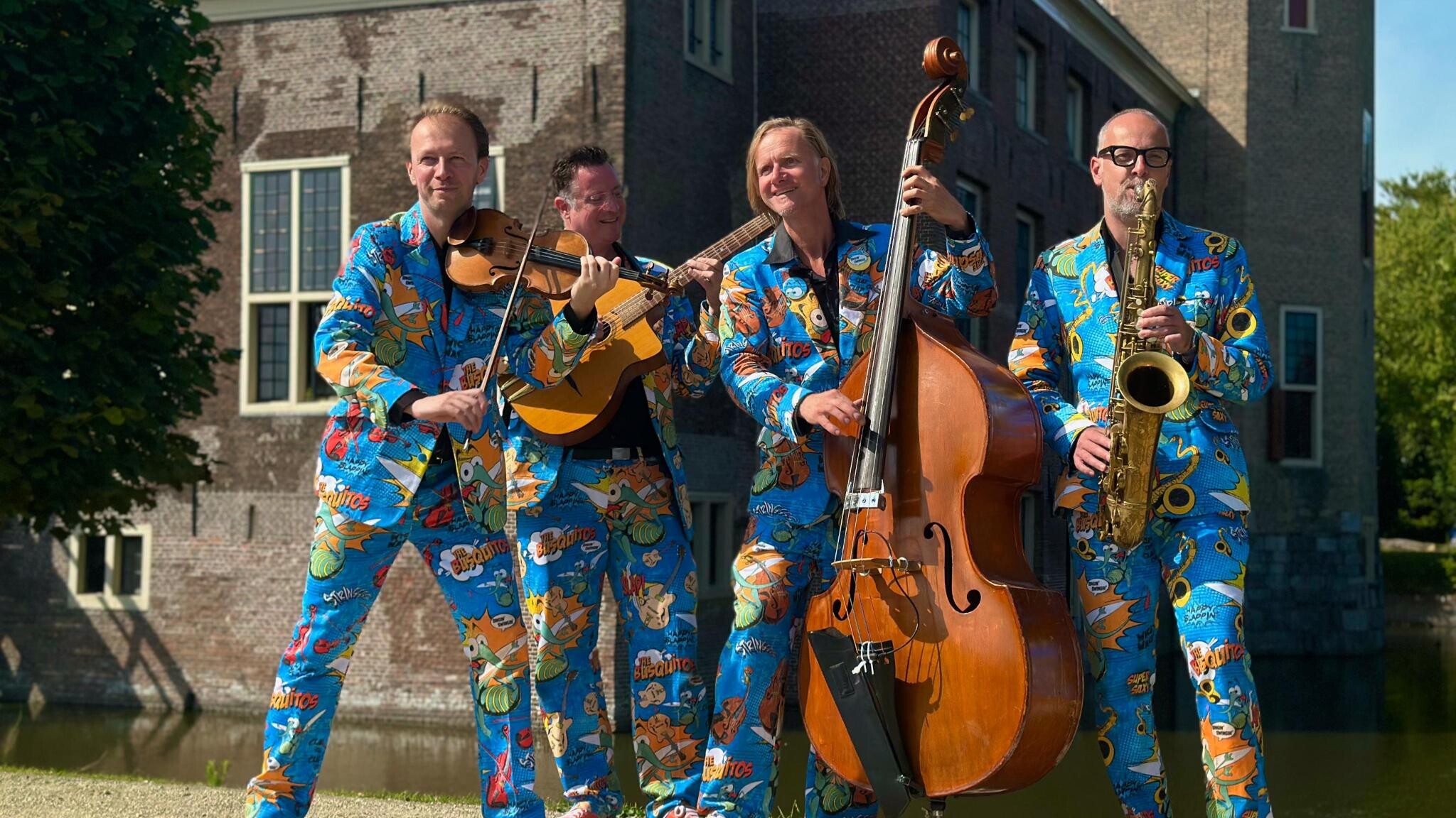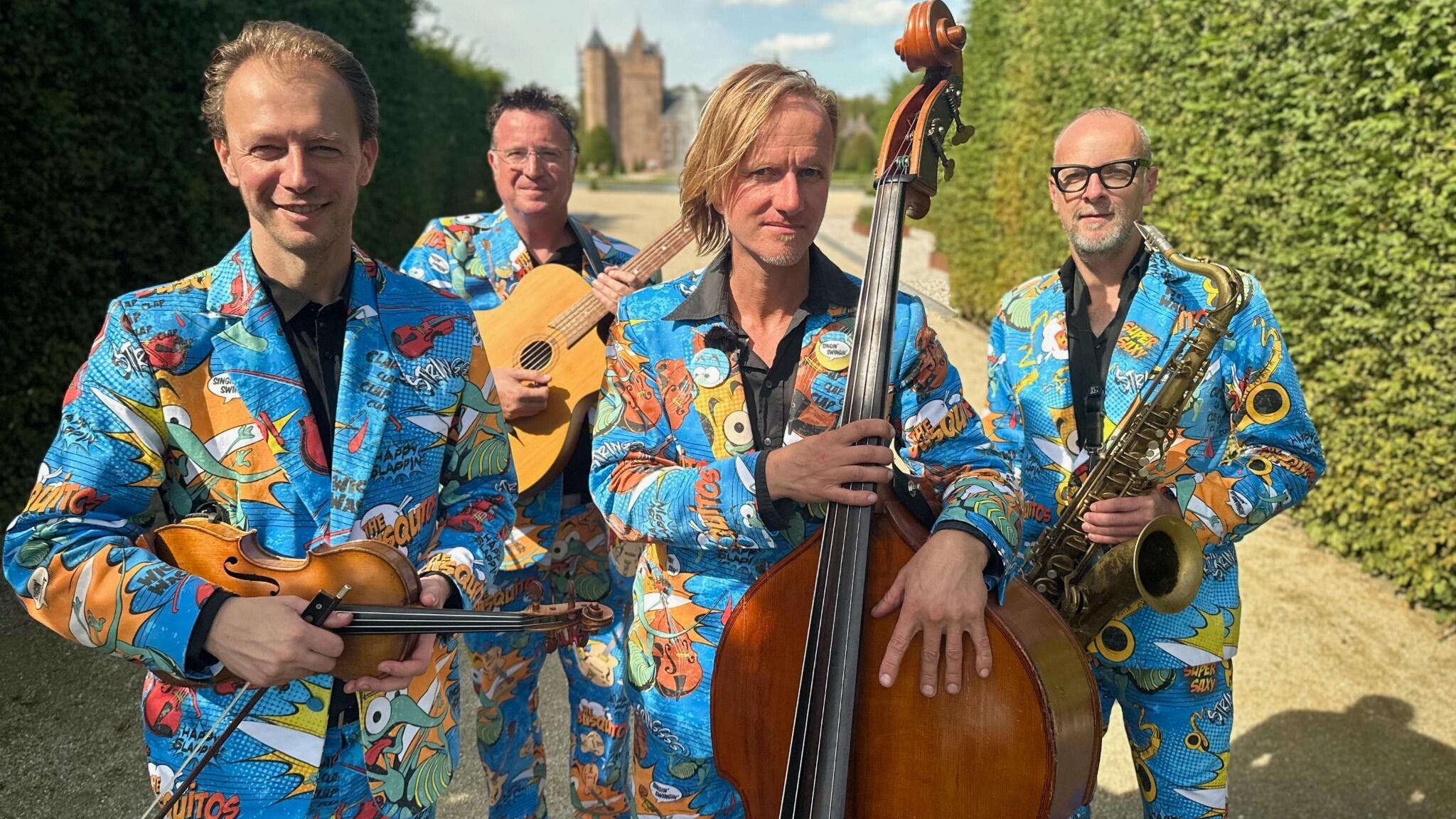 At the heart of The Busquitos is a tight-knit ensemble of talented musicians and performers: Wouter Groenhart as lead vocalist and double bassist, Jelle van Tongeren on violin, Thomas Streutgers on saxophone, and Daniel Versteegh on guitar. Together, they have mastered the art of blending jazz, swing, and humor into a unique musical experience. Their chemistry on stage is undeniable and sets them apart. Explore their world, get to know their musical fusion, and join them on a journey where laughter and melodies unite.